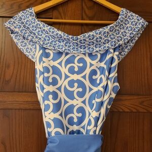 Gretchen Scott Heavens Gate Off Shoulder Belted Dress Blue White Size Large
