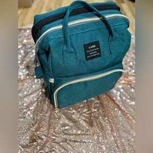 Chic teal backpack by Land. Ideal for daily adventures. Features a roomy main compartment and hidden diaper changing station when needed.
