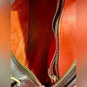 *This bag was dyed black from its original red color*. Adjustable crossbody strap and exterior pocket.