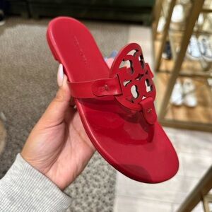 Elegant red sandals with signature logo design. Perfect for casual outings.