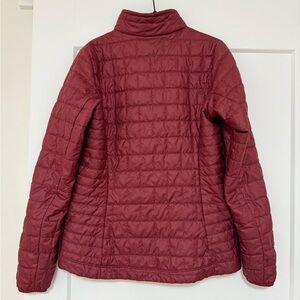 Stylish Patagonia puffer jacket. Features a rich burgundy color. Lightweight and warm. Perfect for outdoor adventures.