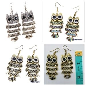 These silver owl-themed earrings feature intricate textured feathers and whimsical designs. The jewelry pieces are adorned with geometric patterns, making them a unique addition to any accessory collection. Perfect for those who appreciate stylish and artistic jewelry.