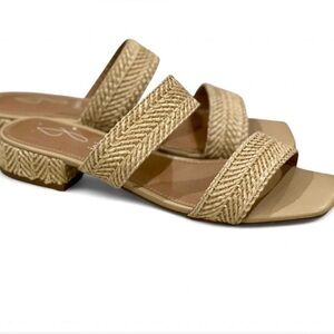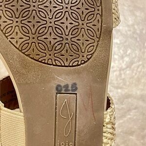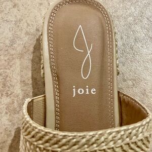Joie Women’s Size 9 tan colored sandals with elegant woven raffia outer design. Comfortable slip-on style with double straps. Some marker on the soles but in great condition.