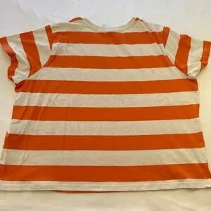 Women's Mickey Mouse striped shirt featuring vintage-style Mickey graphic. Size 2X. Orange and white stripes in 100% cotton. Excellent condition, no noted flaws.