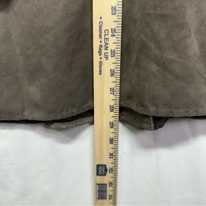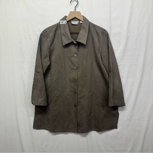 Classic Joan Rivers women’s jacket in a brown/taupe tone. Soft suede-like feel with button front closure, collared neckline, and front pockets. Versatile lightweight jacket perfect for casual or workwear layering.