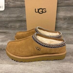 Chestnut suede slip-ons with plush interior. Features UGG logo and sturdy sole.