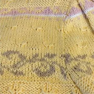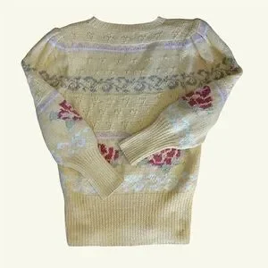 Bright yellow, with knitted-in floral designs, in a fun cable knit, with purple, white, pink, & green colors. Puffed shoulders, with shoulder pads & long dolman sleeves. Long, ribbed cuffs & hem. V neckline, ribbed. 100% cotton. Dry clean.