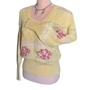 VTG 70s Yellow Pink Floral Cable Knit Vneck Sweater Large *Fits like Small