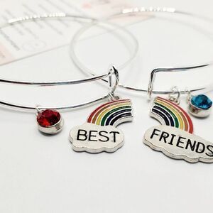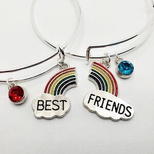 Do you have that special person that you call your best friend? Do you want to get them to know they are a part of your set? These rainbow best friend bracelets would be the absolute perfect gift. You get to keep one, and your best friend gets the other! Each of you will share a part if each other at all times. One bracelet includes the rainbow and cloud with best and personalized with your birthstone gemstone and the other bracelet is the cloud and rainbow with friend also personalized with their birthstone gemstone. Add them to your bundle and let me know which birth months the best friends were born. The bracelet is a stainless steel base with is also lead and nickel free.