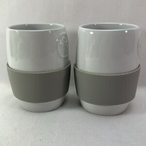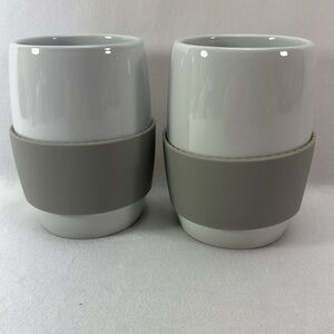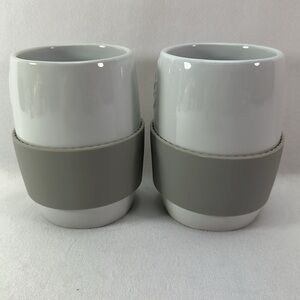 Pampered Chef White Ceramic Mugs with Gray Silicone Grip - Set of 2