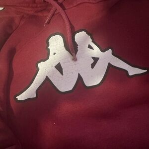 Maroon hoodie with Kappa logo. Features branded sleeve accents. Men’s size large