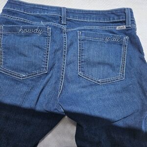 Stylish blue jeans with unique patterned accents. Comfortable boot cut fit. Ideal for casual wear.