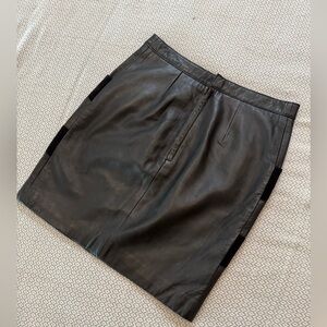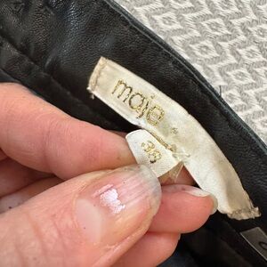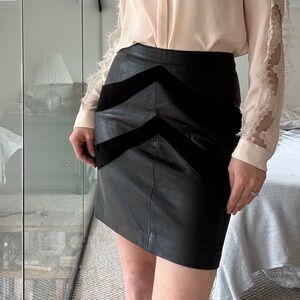 Soft lamb leather and goat suede mini skirt by maje. Deep pockets incorporated into the design with contrasting suede. Pencil silhouette. Button and zip closure at the back. Please see photos for measurements