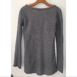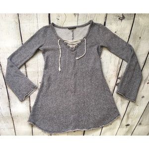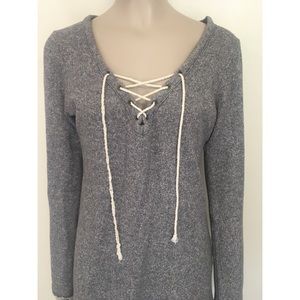 Victoria’s Secret grey pullover sweatshirt with tie detail at v neckline. ( some wear on ties ) Raw cut edge hem and sleeve cuffs. Rounded bottom hemline. Size tag has been cut out. Most fitting fir a small/medium size.