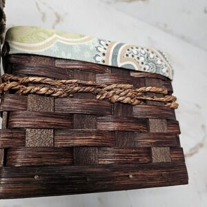 Keywords: woven basket, storage basket, decorative basket, organizer basket, rustic basket, farmhouse decor, fabric liner, handle basket, brown basket, tabletop decor, bathroom organizer, kitchen organizer, home storage, woven container