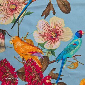 Excellent condition. I only found one minor flaw (see last photo with toothpick). Wonderful scarf for the bird lover! Macaws, lorikeets, african greys, female eclectus, and more adorn this silk scarf. No odors.