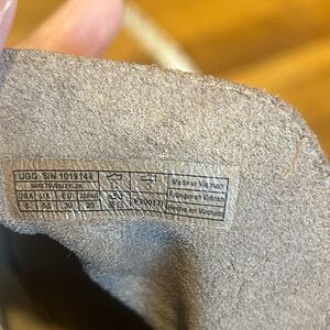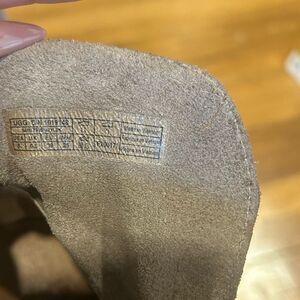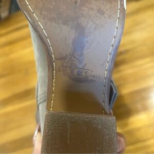 Insole: cushioning poron and foam; leather like sockliner, heat embossed UGG logo. Outsole: leather welt, 2.5 heel wrapped with stack leather, leather like outsole. Suede upper. Metal buckle with gore for secure fit. 4.5 shaft