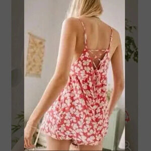Gorgeous floral print romper with adjustable straps in an adorable back tie detail with pockets