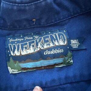 Keywords: Chubbies shirt, men's button down shirt, ski print pocket, blue long sleeve shirt, small men's shirt, novelty print shirt, casual shirt, button up shirt, cotton shirt, designer shirt, weekend wear, skiing apparel, winter fashion, playful print