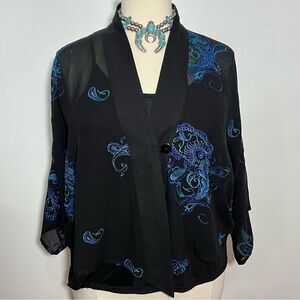 Sheer Cardigan that has a lapel in front that has a one button closure. Lovely turquoise and green paisley print. You will need to wear a cami underneath (does not come with).