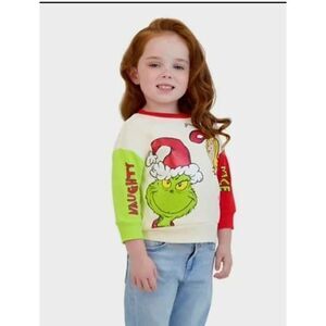 The image on the sweatshirt shows a Dr. Seuss The Grinch Toddler Long Sleeve Sweatshirt, featuring both the Grinch and Cindy Lou Who characters in a festive Christmas design.