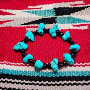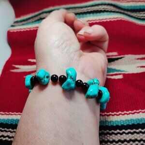 Chunky Rough Polished Natural Turquoise & Black Beaded Stretch Bracelet