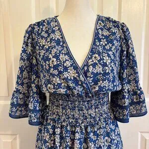 Max Studio Royal Blue Floral Smocked Tiered Mini Dress w/Flutter Sleeves Size S
