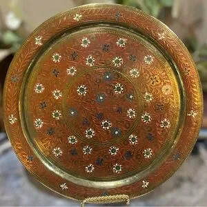 This is a beautiful vintage solid brass with floral enamel detail round tray. Perfect for a vintage home decor accent piece or use as a serving piece. Multi functional piece. Measures 11.25” diameter. Colors include red white gold blue. Beautiful vintage piece.