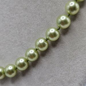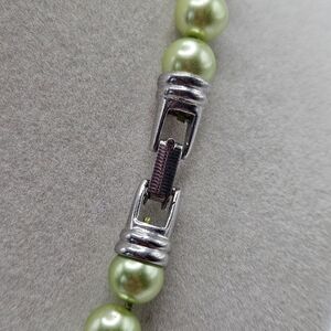 Vintage pastel green glass faux pearl single strand necklace. Silver-tone fold-over clasp close. Measures about 17". Purchased from an estate and no visible maker's mark. Excellent condition and smoke-free home.