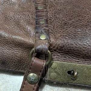 twist-lock closure, brushed brass tone hardware, stud detailing, one rear exterior slip pocket with snap closure