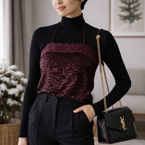 Chic burgundy sequin blouse. Ideal for festive occasions. Sleeveless and stylish.