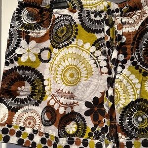 Lightweight Vera Bradley linen PJ shorts and pants have a white background with a fun design in white, brown, and yellow. Elastic waist with drawstring tie, but button detail is non functional and just for decoration. Each pair has two front pockets.