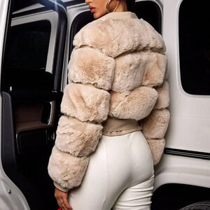 Khaki Preppy Women's Faux Fur Spliced Faux Leather Slim Jacket