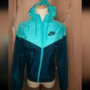 Super cute Nike windbreaker windrunner . It is Color blocked with 2 shades of blue. It is a size xs. It is in excellent condition. It comes from a smoke free home. It measures 23 inches long and 18 inches across under the arm.