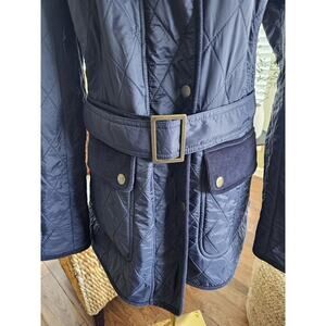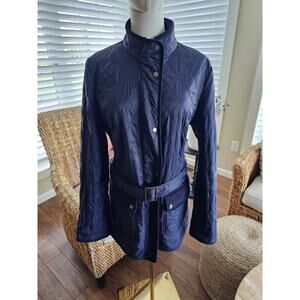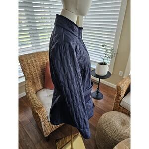 This is a beautiful navy blue classic quilted jacket. Lightweight and very comfortable. Looks flattering and is in excellent condition. Comes from a clean and smoke free home. Please see measurements and additional details in the photos.