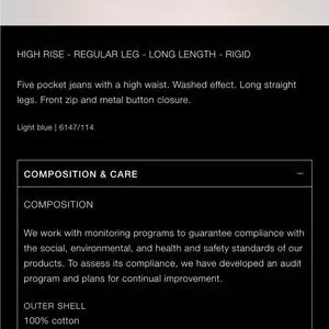 Chic straight leg design. 100% cotton rigid denim fabric. Ideal for casual wear. Worn once.
