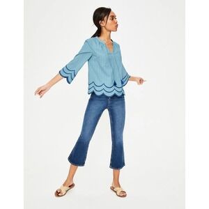The Boden Women's Willa Peasant Boho Blue Tassel Tie Scalloped Hem Lined Top in size 6 is a versatile and stylish piece perfect for various occasions such as travel, casual outings, or workwear. The blouse features a round neckline with a tie closure and tasseled accents, adding a touch of charm to the classic design. Made of lightweight and breathable cotton, this blouse is easy to care for and suitable for all seasons, making it a must-have addition to any woman's wardrobe. Embroidered details and lined Mae this shirt so beautiful.