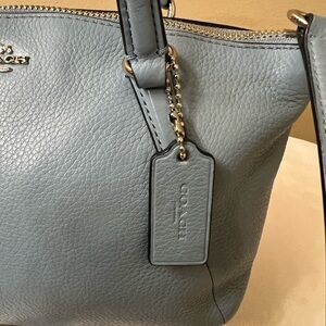 Chic Coach satchel ( mini Kelsey) leather. Features dual handles and a detachable & adjustable strap. In excellent condition no rubbing on corners only callout is there is dark blue line on the back which can be clean is not noticeable but I had to point out. Perfect for versatile styling. Color is teal blue cuz of lighting might show different, silver hardware i include unbranded dust bag.
