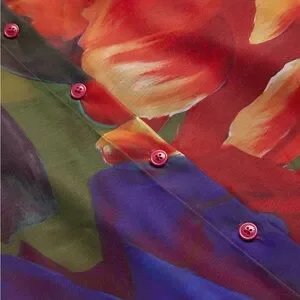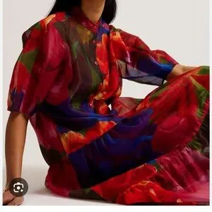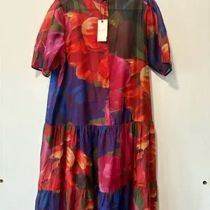 Step into the spotlight with MIRU, our short sleeve button-front dress, featuring a chic mandarin collar and a playful tiered skirt. Drenched in a vibrant floral pattern of vivid reds and blues, this dress brings energy to any occasion. Perfect for twirling through your day, this is one for the bold, the bright, and the beautifully confident. Because why settle for ordinary when you can bloom in full color?