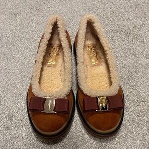 Ferragamo Cognac Ballet Flats Kidskin, Shearling. Brand new. Never worn. I don’t have the box because I bought them while I was traveling.