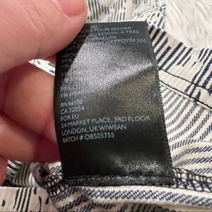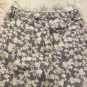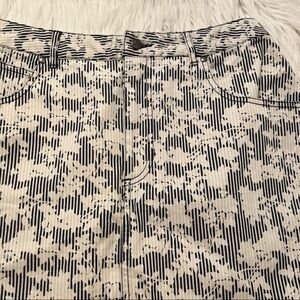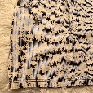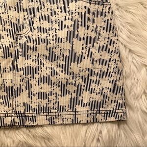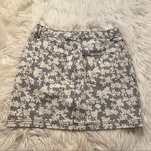 Great condition. BDG. Denim mini skirt. Blue with white railroad stripes, white floral pattern. In a classic slim fit that goes from the natural waist to mid-thigh, topped with five pockets and a button zipper fly. Style B505755. Stretch 99% cotton, 1% spandex. Missing size tag, my best guess is an 8; please see measurements to ensure proper fit. Waist 14.5” Waist to hem 17”. All measurements are approximate and taken laying flat. Smoke free home. No trades, offers welcome.