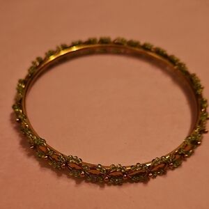 It is paired with a thin gold plated and green gemstone bangle bracelet.
