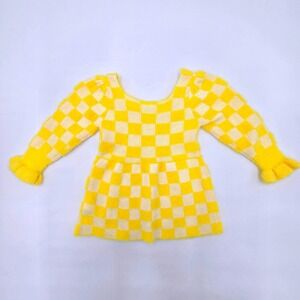 A darling yellow and white checkerboard fuzzy knit button front cardigan for baby. This cozy piece features long sleeves with ruffled cuffs and a classic square neckline. The fuzzy texture adds a touch of charm and warmth to this adorable knitwear.