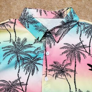 Get ready for your next vacation with this Tropical Palm brand new vibrant button-down short sleeve shirt. Made of lightweight and easy-care polyester, this shirt features a collared neckline and a button-down collar style. The multicolor design adds a pop of color to your wardrobe, while the short sleeves make it perfect for warm weather destinations. The shirt comes in size Large. Whether you're heading to the beach or exploring a new city, this shirt is the perfect addition to your casual wardrobe.