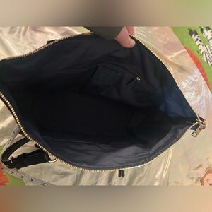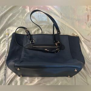 Stylish and super functional Kleo Coach tote in dark blue leather/suede combo. This is missing the original leather long strap but I am including a fun thick patterned strap that matches well! Ideal for versatile use. Please view photos for additional information on size and condition. Items come from a dog friendly home. Thank you!