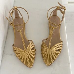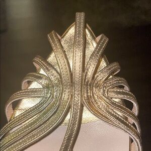 These LeatherGoose sandals showcase a luxurious gold finish and a sophisticated strappy construction, ideal for elevating any ensemble. The open-toe design and secure ankle strap provide both elegance and comfort, making them perfect for any special occasion.