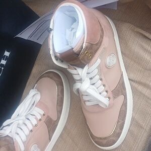 Chic high-top sneakers by Coach. Features blush and beige tones with lace-up front and signature logo.