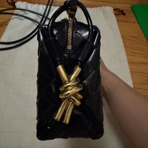 Elegant black woven leather crossbody bag with a sleek design. Perfect for any occasion.