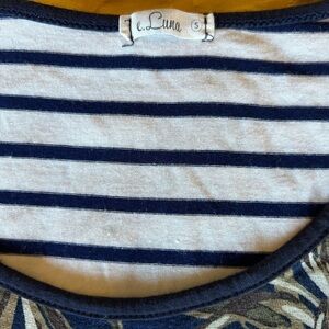 UC Tank Top by L Luna, size small. Front is navy blue with a beautiful, bright floral print. Pocket on the front and the back of the top are white with navy stripes.