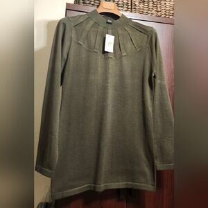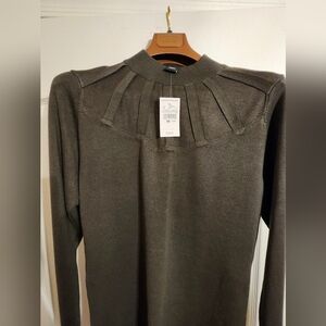 Stylish olive green long sleeve sweater. Features a pleated neckline for added elegance.